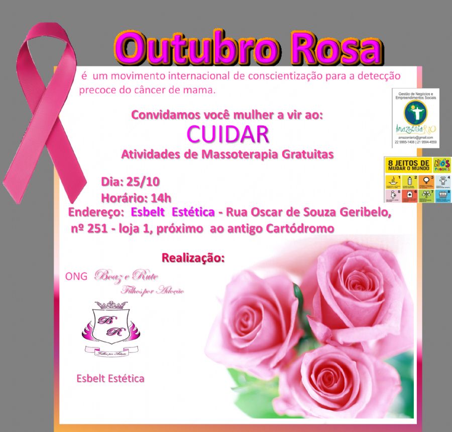 No dia 25/10 às 14h, a ONG Boaz e Rute Filhos por Adoção promoverá o Open Massage para Mulheres no encerramento da Campanha Outubro Rosa da ONG Boaz e Rute Filhos por Adoção.