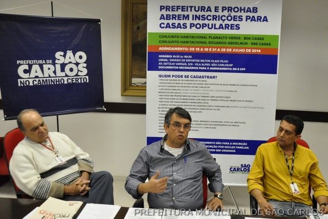 Em coletiva de imprensa realizada nesta segunda-feira (14), na Prefeitura Municipal, o presidente da PROHAB (Progresso e Habitação São Carlos), Mauro Moraes, juntamente com o chefe de gabinete José Luiz Galvão e o diretor financeiro, Antonio Cesar Polimeno, anunciou a abertura das inscrições para os novos empreendimentos habitacionais de São Carlos, os residenciais Planalto Verde e Eduardo Abdnelnur. Serão 1.792 moradias, sendo 806 destinadas ao Planalto Verde e 986 ao Eduardo Abdelnur.