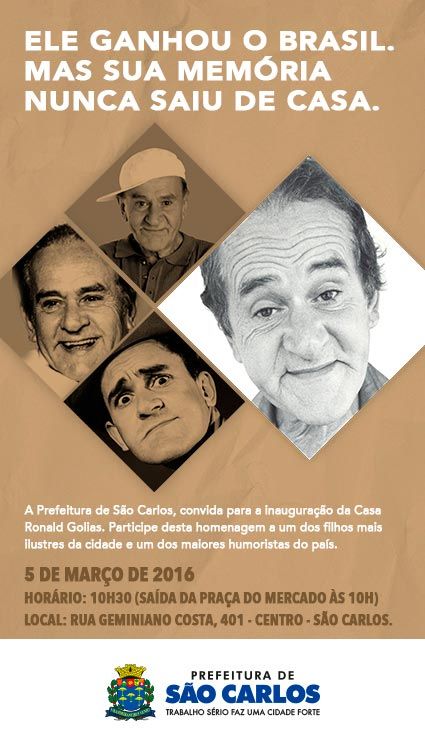 A Prefeitura de São Carlos inaugura no próximo sábado (5), a partir das 10 horas da manhã, um memorial na casa em que viveu o humorista Ronald Golias. Localizada na Rua Geminiano Costa, 401, no Centro da cidade, “A Casa Ronald Golias” visa preservar a memória de um dos filhos mais ilustres da cidade e um dos maiores humoristas do país.