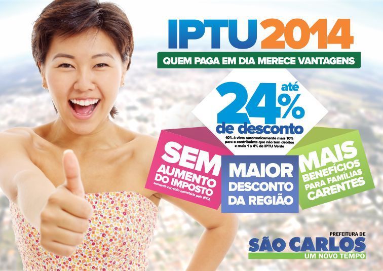 “O desconto para quem não tem débitos com a municipalidade é imediato, de 10%. Efetuando o pagamento do carnê de 2014 à vista, o contribuinte recebe outros 10% de desconto. E caso tenha se inscrito no IPTU Verde ainda é possível ganhar de 1 a 4% a mais de desconto. O contribuinte pode totalizar desconto de 24%, valor comprovadamente, um dos maiores da região”, destaca Poianas.