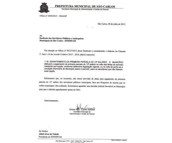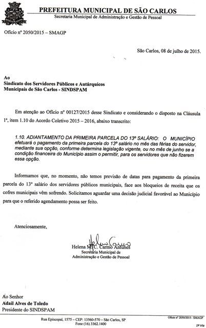 A Prefeitura Municipal de São Carlos por meio da Secretaria Municipal de Administração e Gestão de Pessoal, enviou ofício em resposta ao questionamento do Sindicato dos Servidores Públicos e Autárquicos Municipais de São Carlos (Sindspam), sobre o não pagamento da primeira parcela do 13º salário aos servidores municipais.