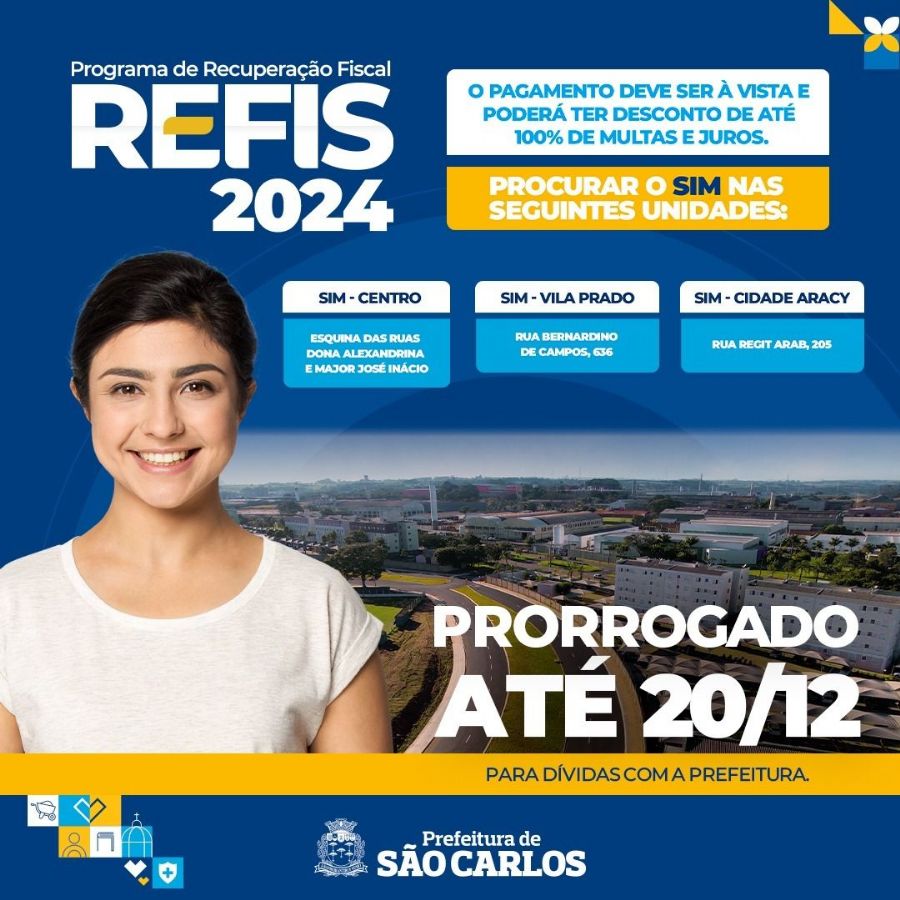 A Prefeitura de São Carlos, por meio da Secretaria Municipal de Receitas e Rendas, informa que o Programa de Recuperação Fiscal (REFIS), que possibilita que o contribuinte inadimplente regularize seus débitos fiscais com remissão de multas e juros, foi prorrogado até o dia 20 de dezembro. O programa é aplicado somente às dívidas com a Prefeitura, não sendo extensivo as autarquias e fundações. Até o momento o município já arrecadou com o REFIS R$ 5,5 milhões.