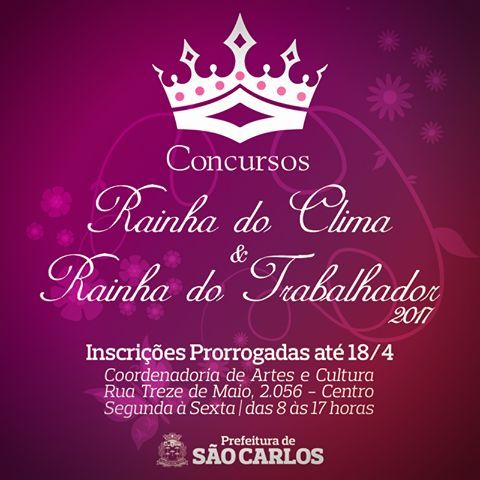 A inscrição do concurso para Rainha do Clima ou Rainha do Trabalhador 2017 foi prorrogada. As interessadas podem se inscrever até o dia 18 de abril. O evento será realizado no dia 20 de abril, a partir das 20h, no Teatro Municipal “Dr. Alderico Vieira Perdigão”.
