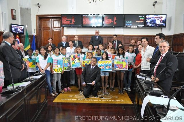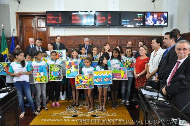Estiveram presentes os alunos da Escola Municipal de Educação Básica (EMEB) Professor Afonso Fioca Vitali (CAIC), que produziram releituras de Romero Brito, além de representantes da Secretaria de Educação, o presidente da Câmara Marquinho Amaral e vereadores.