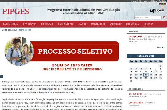 O Programa Interinstitucional de Pós-Graduação em Estatística UFSCar-USP (PIPGEs) está com inscrições abertas até o dia 29 de novembro no processo seletivo para os seus cursos de mestrado e doutorado, com ingresso no início de 2019. O Programa é uma parceria da UFSCar com o Instituto de Ciências Matemáticas e de Computação (ICMC) da Universidade de São Paulo (USP), também sediado em São Carlos.