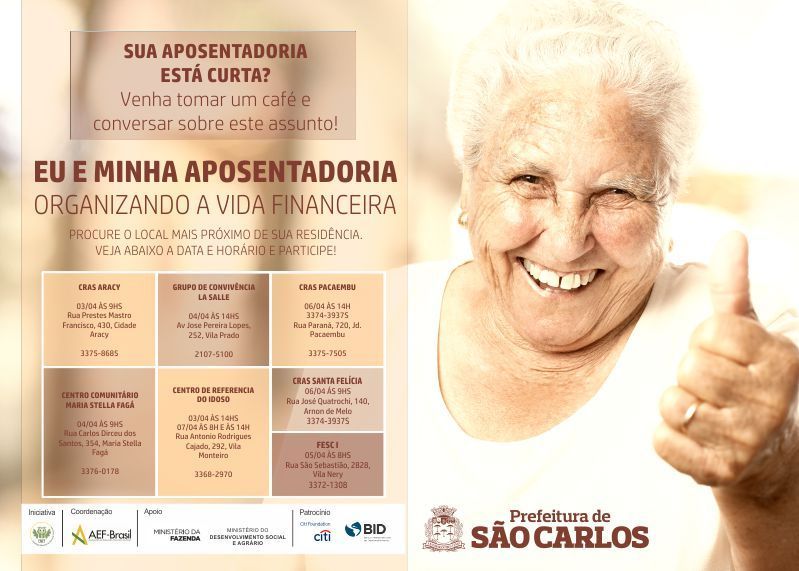 As inscrições para o programa de educação financeira para Idosos “Eu e minha aposentadoria: organizando a vida financeira” estão abertas. Podem participar aposentados com renda até dois salários mínimos, e que tenham idade igual ou superior a 60 anos. Os interessados devem procurar os CRAS, o Centro de Referência do Idoso, a Fesc (Fundação Educacional de São Carlos) e também a Secretaria de Cidadania e Assistência Social.