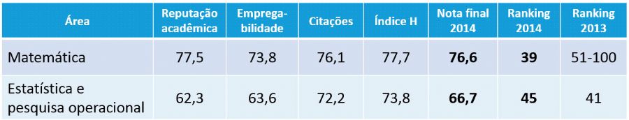 Confira, na tabela abaixo (em anexo), a avaliação recebida em cada critério nas áreas de atuação do ICMC em que a USP ficou entre as 50 melhores (matemática; estatística e investigação operacional). Vale ressaltar a evolução dos resultados na área de matemática: em 2013, a USP não estava entre as 50 melhores do mundo.