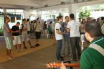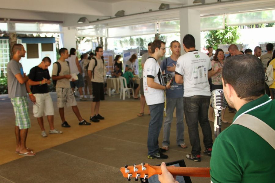 No final, os calouros puderam conversar diretamente com os funcionários nos estantes temáticos montados no hall da biblioteca, assistindo a uma partida de futebol de robôs e ouvindo à boa música do funcionário Erick Previato.