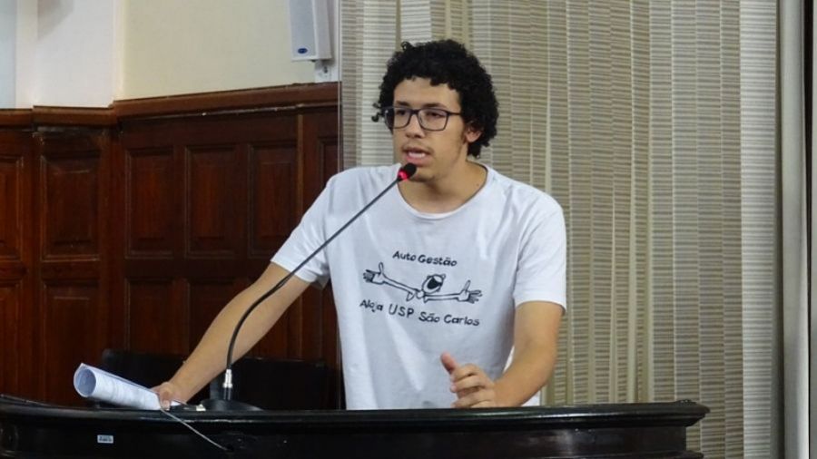O estudante Natã Ferraz dos Santos representando CAASO (Centro Acadêmico Armando de Salles Oliveira) da Universidade de São Paulo (USP), pronunciou-se na Tribuna Livre da Câmara na sessão plenária desta terça-feira (16) para expor o “desrespeito à garantia do direito a educação e permanência na universidade e perseguição política aos estudantes do movimento estudantil por parte dos gestores públicos da USP de São Carlos”.