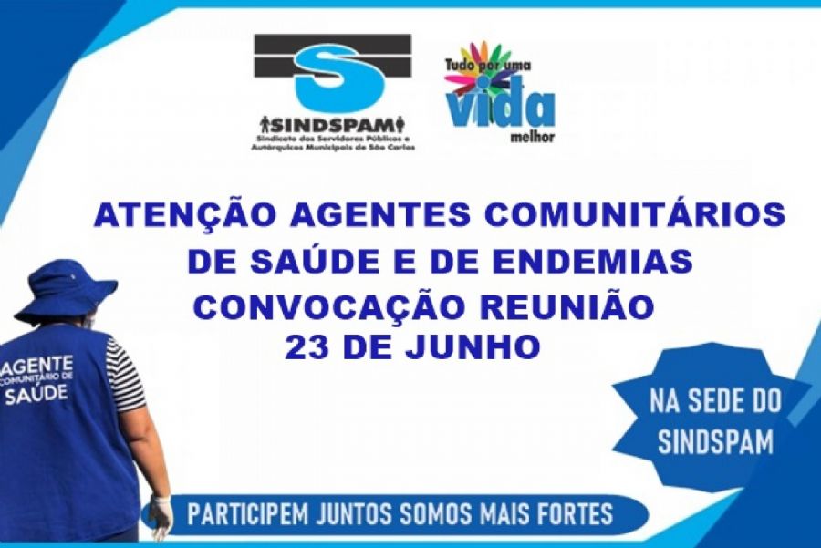Atenção Agentes Comunitários de Saúde e de Endemias o Sindicato dos Servidores Públicos e Autárquicos Municipais de São Carlos (SINDSPAM), está convocando a todos para participarem de uma reunião, para discussão de assuntos de interesse da categoria.
