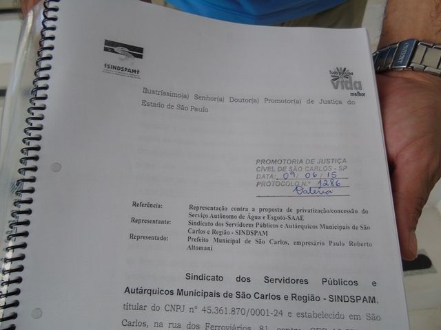 O Sindicato dos Servidores Públicos e Autárquicos Municipais de São Carlos (Sindspam), protocolou nesta terça-feira (09) junto ao Ministério Público (MP), representação contra a Prefeitura Municipal de São Carlos, para evitar que a Administração conceda, privatize ou realize qualquer outro tipo de negociação do Serviço Autônomo de Água e Esgoto (SAAE). O sindicato sugere ainda que seja aberta uma ação civil pública com pedido de liminar, até que tudo o que foi denunciado seja apurado pelo MP.