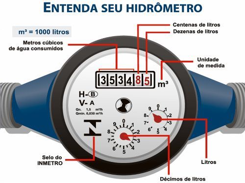 Para calcular o consumo mensal basta registrar o valor que aparece no hidrômetro e reduzir da leitura do mês anterior.