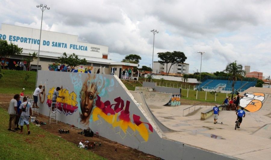 O complexo esportivo do Santa Felícia está de cara nova. Uma ação do Sanca Hip Hop renovou o grafite dos paredões do espaço, no último domingo (2/12). O evento também reuniu outros elementos da cultura do Hip Hop: break, rap e DJ e contou com a participação dos artistas locais.