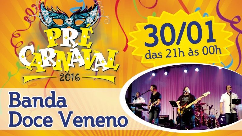 Banda Doce Veneno - Passeando pelos mais variados estilos musicais, a Doce Veneno, uma das bandas mais queridas de São Carlos e região, foi fundada em 1976 pelo maestro Páris Mucillo e apresenta-se em carnavais desde então, tocando e resgatando as tradicionais marchinhas e sambas que marcaram época. Com mais de 40 anos de estrada, e histórias alegres de muitos carnavais, a Doce Veneno já executou mais de 500 músicas em suas apresentações carnavalescas, com destaque para as tradicionais. Como nos anos anteriores, neste show Pré-Carnaval o público do SCC terá toda liberdade para fazer seus pedidos musicais na noite carnavalesca que será de pura diversão!