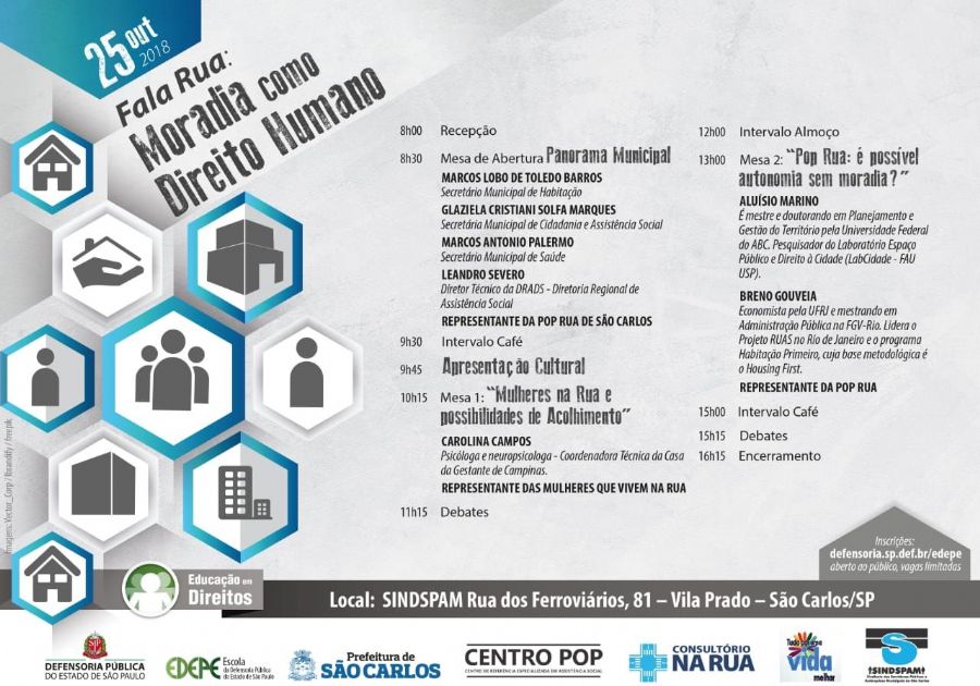 São Carlos sediará na próxima quinta-feira (25) o seminário, Fala Rua: Moradia como Direito Humano onde serão discutidos os desafios para garantir o direito à moradia adequada a todo cidadão, entre outros assuntos. O evento é promovido pela Defensoria Pública do Estado de São Paulo com apoio da Prefeitura Municipal de São Carlos e o Sindicato dos Servidores Públicos Municipais e Autárquicos de São Carlos (SINDSPAM).
