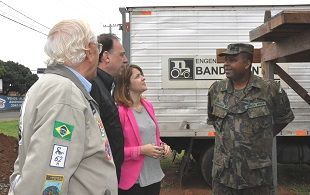 Os secretários Márcio Marino (Obras Públicas), e Lauanna Campagnoli (Habitação e Desenvolvimento Urbano), receberam, na manhã desta sexta-feira (18), na rotatória da Rua Miguel Petroni com a Avenida João Dagnone, no Santa Felícia, a equipe de militares da Aeronáutica que fará a montagem do avião Xavante.