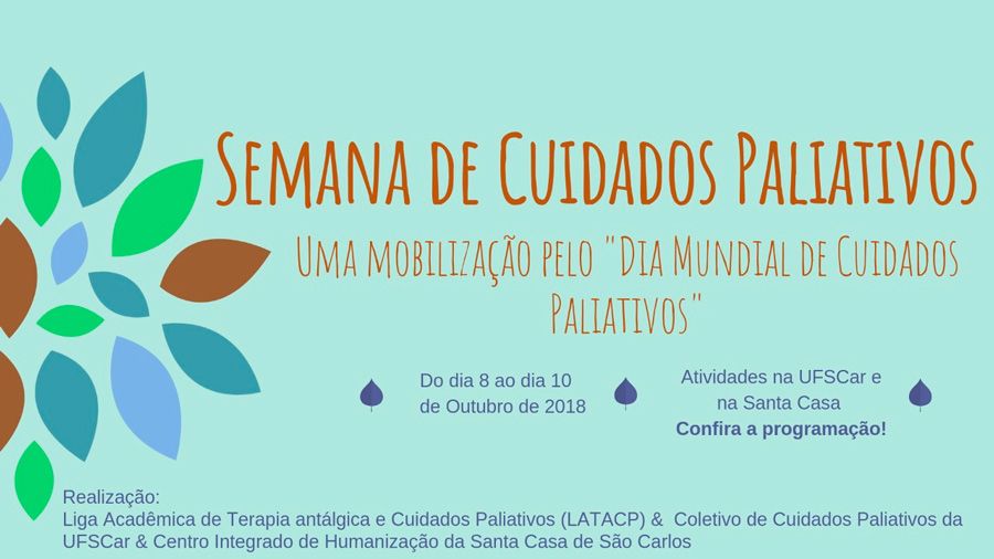 De 8 a 10 de outubro será realizada, em São Carlos, a Semana de Cuidados Paliativos. O evento é uma parceria entre a UFSCar e a Santa Casa da cidade e celebra o Dia Mundial de Cuidados Paliativos, comemorado todos os anos no segundo sábado de outubro. As atividades da Semana são gratuitas e abertas ao público.