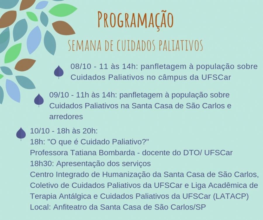 A programação terá distribuição de panfletos sobre os cuidados paliativos para a população nos dias 8 e 9 de outubro. No dia 10, a partir das 18 horas, acontece a palestra "O que é Cuidado Paliativo?", conduzida por Tatiana Bombarda, docente do Departamento de Terapia Ocupacional (DTO) da UFSCar. Após a palestra, haverá uma apresentação dos serviços realizados pelo Centro Integrado de Humanização da Santa Casa de São Carlos, pelo Coletivo de Cuidados Paliativos da UFSCar e pela Liga Acadêmica de Terapia Antálgica e Cuidados Paliativos (LATACP), também da Universidade, todos envolvidos na organização da Semana. A atividade acontece no Anfiteatro da Santa Casa e não é preciso fazer inscrição.