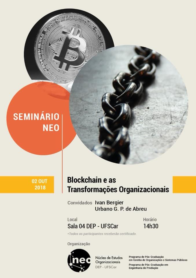 Na próxima terça-feira, dia 2 de outubro, o Núcleo de Estudos Organizacionais (NEO) da Universidade Federal de São Carlos (UFSCar) promoverá o seminário "Blockchain e as transformações organizacionais", que será ministrado por Ivan Bergier e Urbano de Abreu, pesquisadores da Embrapa-Pantanal.