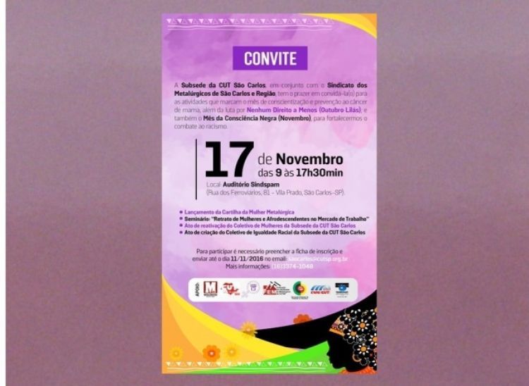 A Subsede da CUT São Carlos estará realizando no próximo dia 17 de Novembro uma série de atividades que marcam o mês de conscientização e prevenção ao câncer de mama, além da luta por Nenhum Direito a Menos (Outubro Lilás); e também o Mês da Consciência Negra (Novembro), para fortalecermos o combate ao racismo.