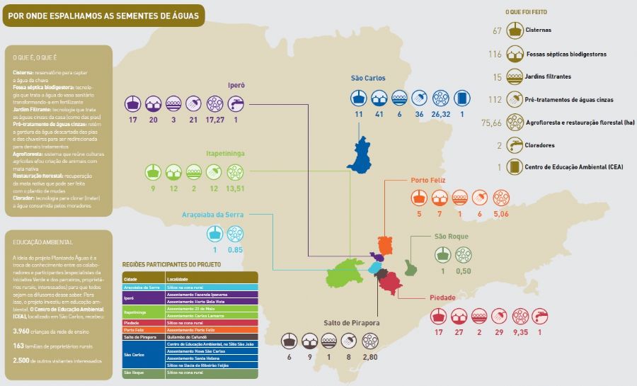 O projeto Plantando Águas, realizado entre 2013 e 2015, em oito municípios de São Paulo, em parceria com cerca de 20 instituições, beneficiou diretamente cerca de 160 famílias de assentamentos de reforma agrária, bairros rurais e comunidade remanescente do quilombo.