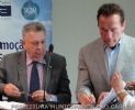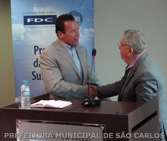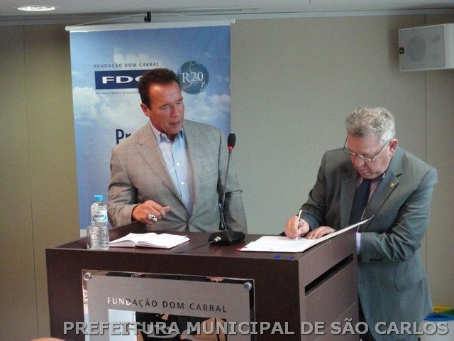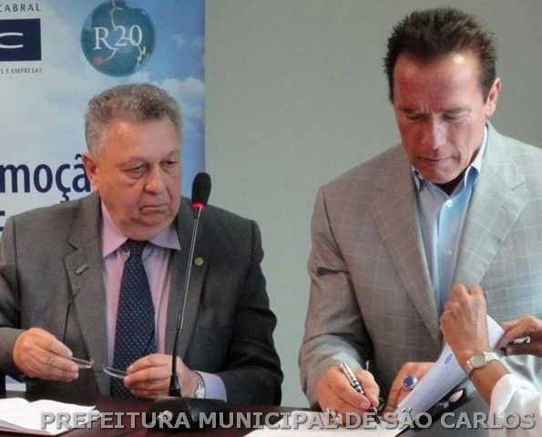 O secretário municipal de Desenvolvimento Sustentável, Ciência e Tecnologia de São Carlos, José Galizia Tundisi e o ex-governador norte-americano e fundador da Organização Não-Governamental Regions of Climate Action (R20), Arnold Schwarzenegger, assinaram, na última quinta-feira (25), na unidade Rio de Janeiro da Fundação Dom Cabral, um Memorando de Entendimento (MoU) relativo a estudo de viabilidade para iluminação pública LED de São Carlos. Criado em 2010, com o apoio da ONU, o R20 ajuda estados, províncias, regiões e governos de todo o mundo a desenvolver, aplicar e comunicar projetos voltados para a economia sustentável.