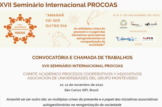 Até o dia 14 de julho está aberto o prazo de submissão de resumos para os grupos de trabalho do XVII Seminário Internacional do Comitê Acadêmico de Processos Cooperativos e Associativos (Procoas) da Associação de Universidades Grupo Montevidéu (AUGM). O evento será realizado na UFSCar nos dias 10 e 11 de novembro.