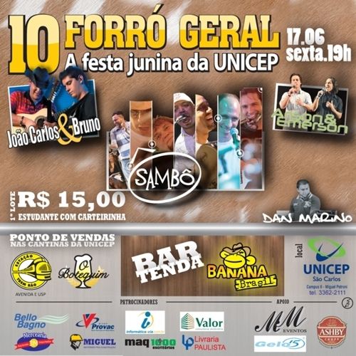 Haverá também as tradicionais barracas de festa junina, comidas típicas e fogueira. O primeiro lote de convites já está à venda nas Cantinas da UNICEP, na Lanchonete Trem Bão (Avenida e USP) e no bar O Botequim. Os ingressos antecipados custam 15 reais (Estudante com carteirinha).
