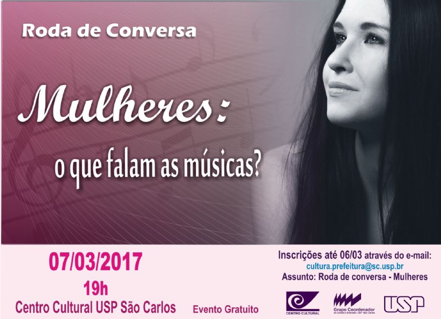 Os interessados em participar do evento gratuito podem se inscrever até o dia 6 de março pelo e-mail: cultura.prefeitura@sc.usp.br, assunto "Roda de conversa - Mulheres". Realização: Centro Cultural e Grupo Coordenador das Atividades de Cultura e Extensão.