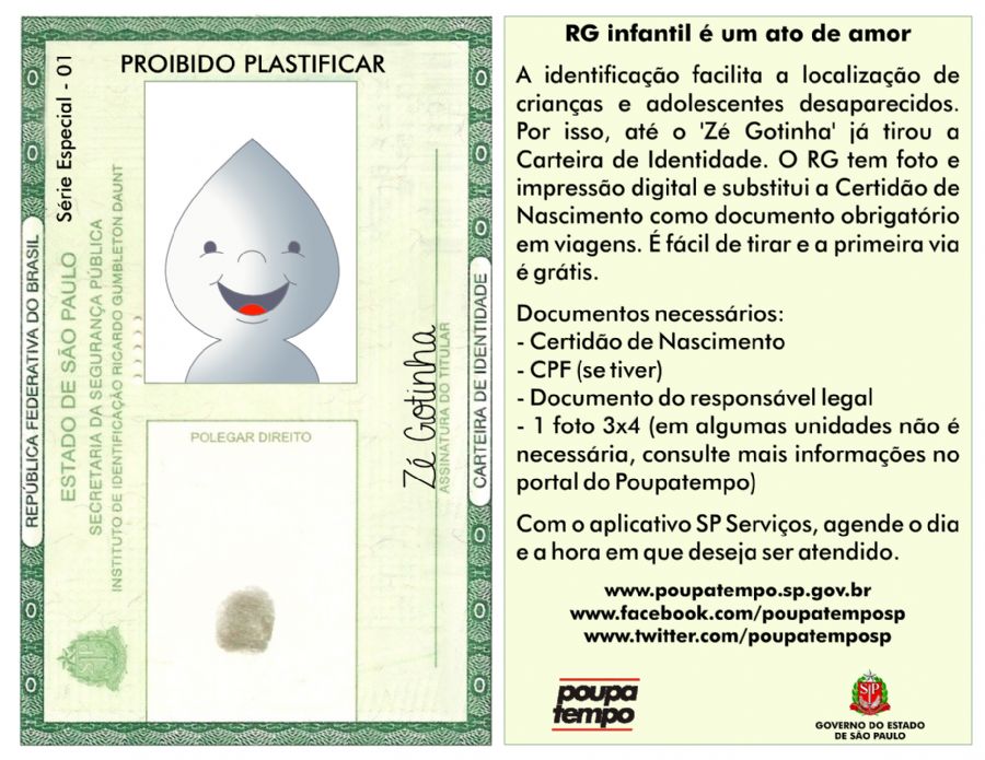 Em homenangem ao Mês das Crianças, o Poupatempo está distribuindo em todas as suas 66 unidades cópias do RG do Zé Gotinha, o famoso personagem das campanhas de vacinação. O "documento" tem desenho do personagem enviado especialmente pelo seu criador, o artista plástico Darlan Rosa.